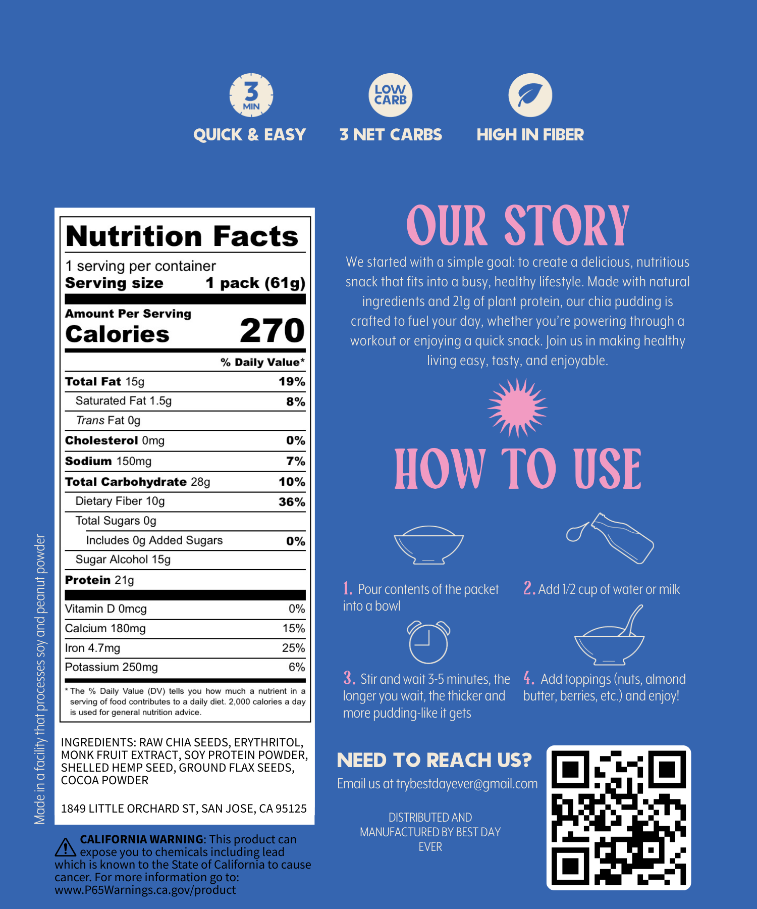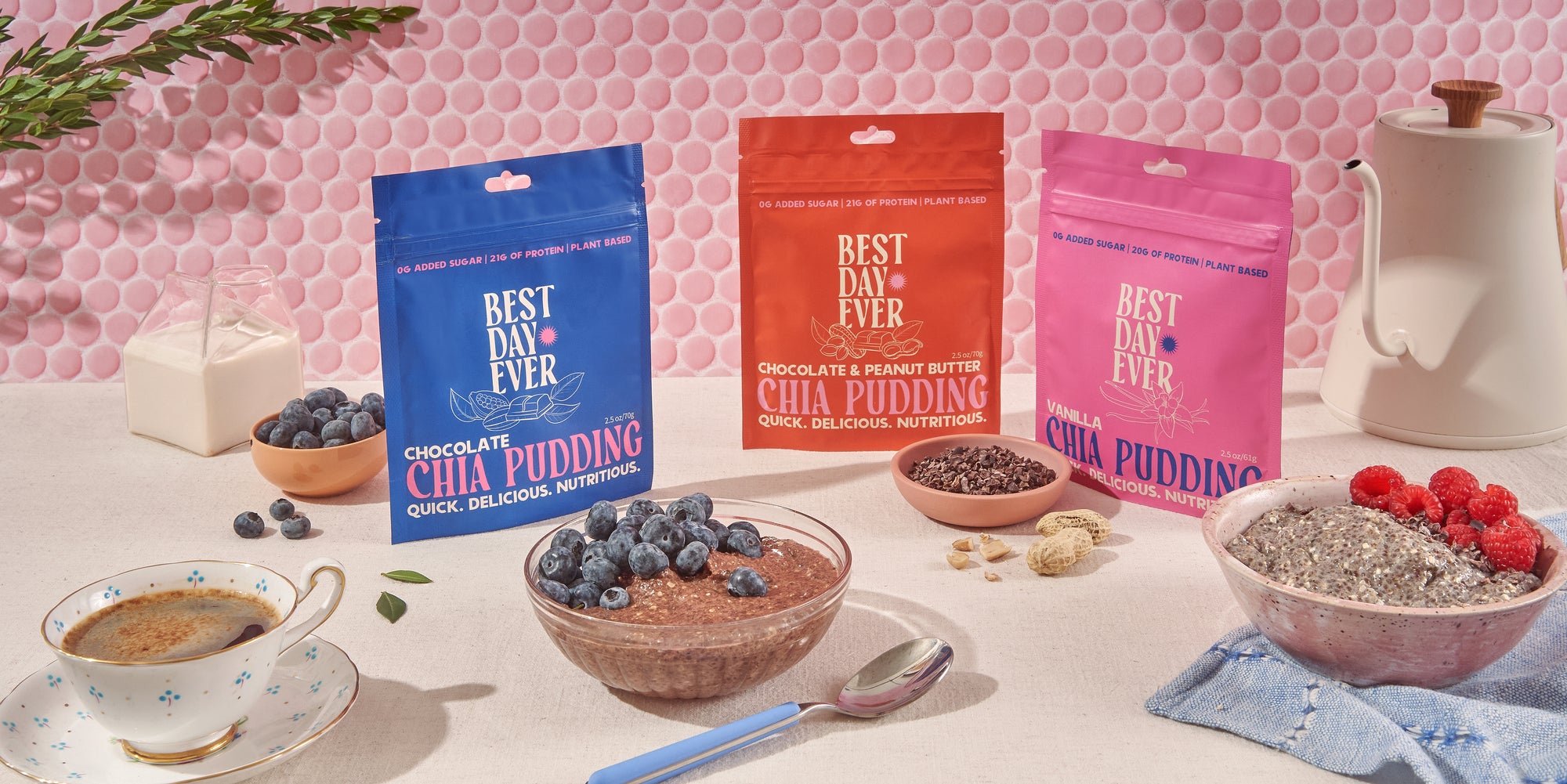 Start your morning off right with our Chia Pudding Bundle! Each bundle includes three flavors: chocolate, chocolate and peanut butter, and vanilla. Simply mix with your favorite ingredients and wait 3-5 minutes for a delicious and nutritious breakfast packed with 21g of protein and 0 added sugar. It's the perfect, quick and easy breakfast option.