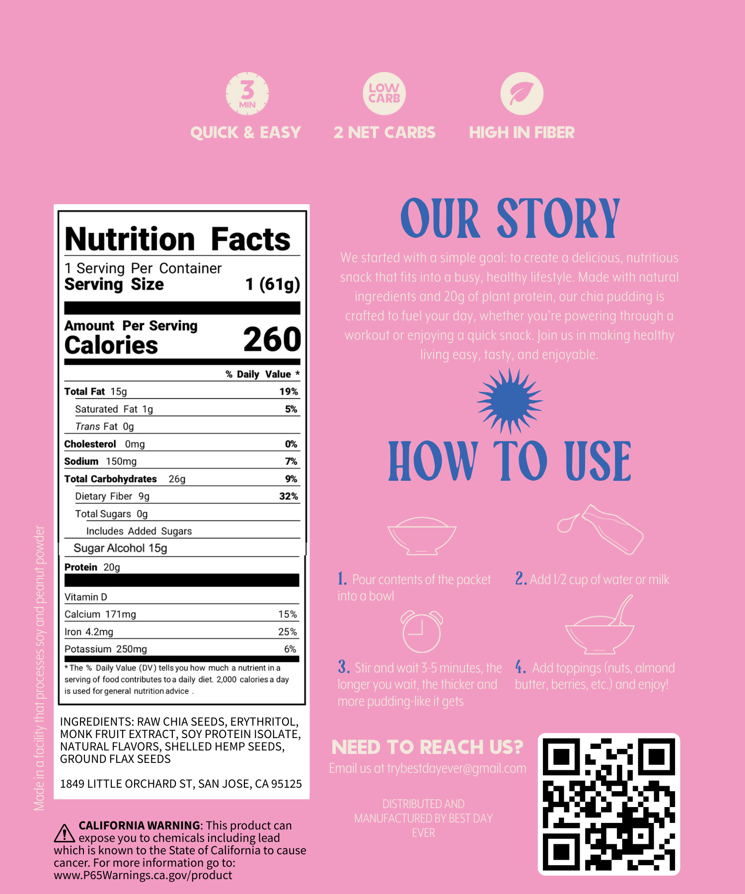 Experience the perfect blend of convenience and nutrition with our instant chia pudding. Ready in minutes, this delicious treat is packed with 21g of protein and made from wholesome ingredients to fuel your day.